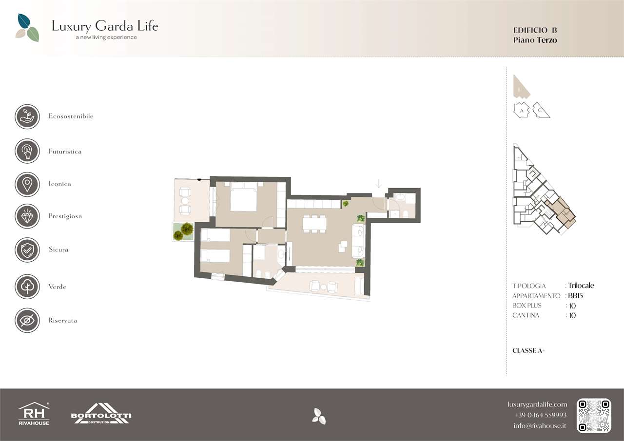 In una palazzina moderna e di recente costruzione proponiamo un trilocale nuovo, mai abitato ed esente da Legge Gilmozzi, ideale per chi cerca un’abitazione pronta all’uso, curata e inserita in un contesto tranquillo. L’appartamento si trova al terzo piano, posizione che garantisce ottima luminosità durante tutta la giornata e una piacevole sensazione di privacy. La zona giorno si sviluppa in un ampio open space con soggiorno e cucina a vista, valorizzato da grandi superfici vetrate che conducono all’ampio terrazzo affacciato sulla campagna, una vista aperta e rilassante perfetta per colazioni all’aperto e momenti di tranquillità. In questa area è presente un bagno cieco, finemente rifinito e pensato per servire comodamente la parte living. La zona notte è ben separata e pensata per garantire comfort e silenzio. Si compone di due camere da letto di buona metratura, di cui una dotata di terrazzo privato, ideale come piccolo spazio esterno riservato. Completa il reparto notte un secondo bagno, moderno e funzionale, dedicato esclusivamente a questo ambiente. La proprietà è ulteriormente arricchita da un garage doppio in lunghezza, comodo sia per il parcheggio di due vetture sia come spazio aggiuntivo per biciclette o attrezzature, e da una cantina molto grande, pratica e versatile per soddisfare esigenze di deposito o hobby. Un immobile completo, luminoso e dotato di tutti i comfort delle nuove costruzioni, perfetto per chi desidera un’abitazione nuova, efficiente e immersa nella tranquillità del verde circostante.